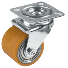 Plaatstalen vork, verzinkt. Zwenkkrans dubbel gelagerd. Wiel polyurethaan (92 +/-2 graden Shore A) band met stalen kern. Kogellager. Geeft niet af / streept niet. Bedoeld voor op mooie gladde vloeren.